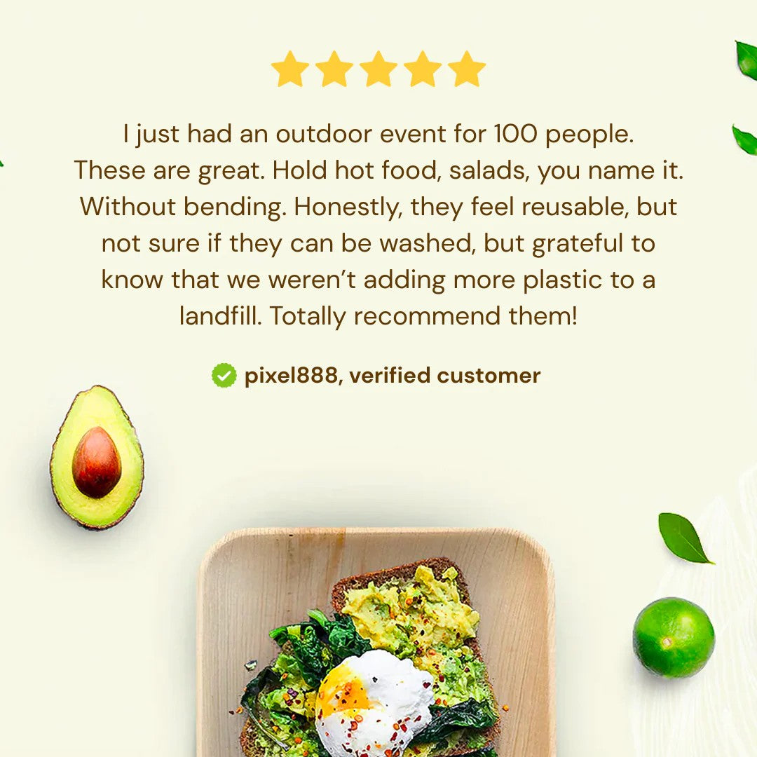 Our palm leaf plates are surprisingly sturdy. Far stronger than paper plates. They can easily hold hearty meals without bending orbreaking… because we know you wouldn’t want your dinnerfalling apart,or your guests’ trust in you.
